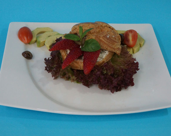 طبقنا اليوم متميّز، إذ إن عجينة الشو تُستعمل في معظم الحلويات, وقد مزجنا الطعم الحلو والمالح باستعمال جبنة الماعز والفيلادلفيا، والفراولة، الأفوكادو، البندورة الكرزية والخس. وعجينة الشو تباع مخبوزة وجاهزة للاستعمال. هذا الطبق سريع التحضير وعلى الطريقة الفرنسية.